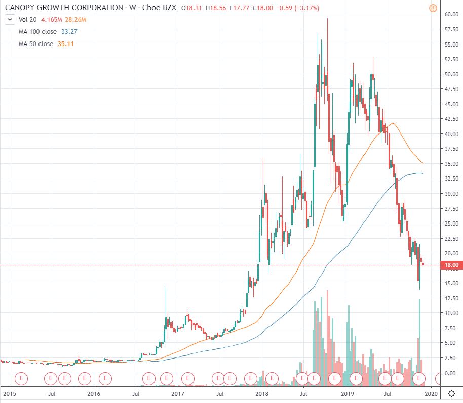As you can see from the chart above, there was a massive surge in CGC’s share price leading up to the legalization of cannabis back in late 2018. This growth was short cut however by a huge earnings miss in November of 2018, with a quarterly loss of -$1.52/share compared to the estimated loss -$0.12/share. There was then a quick correction to this massive drop, nearly 50%, and then a slow decline in price. The stock is currently sitting at around $18/share with most estimates evaluating the price between $20 – $28/share it’s easy to see that it’s a steal for $18/share.